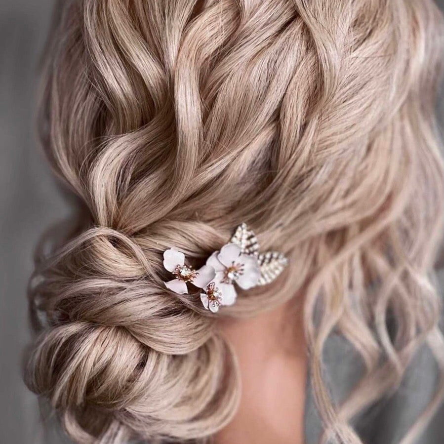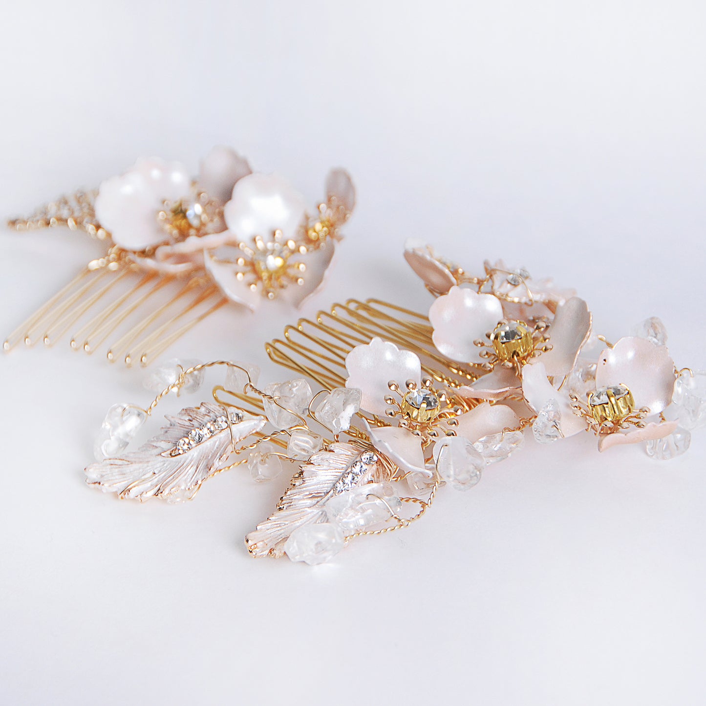 We are head over heels for this comb set, with it’s cluster of shimmery enamelled cherry blossom flowers, organic gemstones and sparkling rhinestones. This pale pink and gold feminine design is ideal for brides who are looking for a rustic, tousled, unstructured look and can be worn in a variety of ways as seen on our models. These combs are comfortable to wear with flexible metal grips.